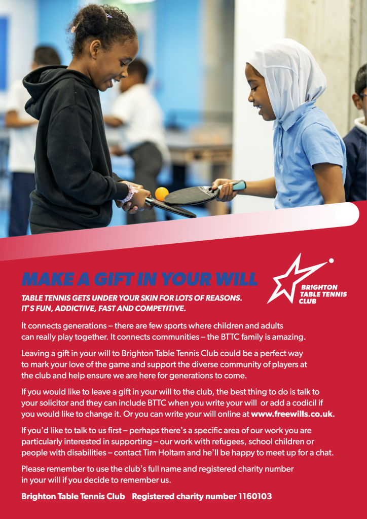 Leaving a gift in your will to Brighton Table Tennis Club could be a perfect way to mark your love of the game and support the diverse community of players at the club and help ensure we are here for generations to come.